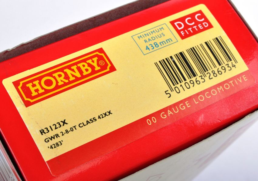 An original boxed Hornby made 00 gauge model railway trainset locomotive engine No. R3213X Great Western Railways 2-8-0T Class 42XX ' 4283 '. DCC fitted. Highly detailed model appearing mint and likely unused, within original box with paperwork.