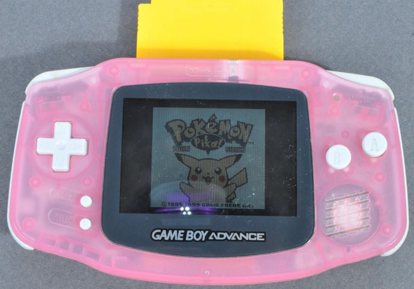 A collection of original Nintendo made handheld portable video game consoles and games comprising Game Boy Advance in crystal pink, 2x Game Boy Advance SP in pink & silver, Pokémon Yellow, SpongeBob SquarePants Supersponge, Lego Star Wars, Yu Gi Oh Ultimate Masters Edition, Star Wars Trilogy and other accessories. Good collection.