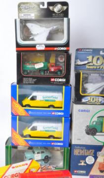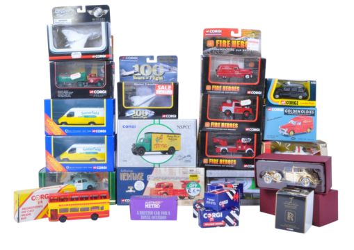 A collection of x23 assorted Corgi made diecast model cars buses and other vehicles from the Classics, Superhaulers, Heritage, Fire Hero and other ranges. Models to include; 418 London Taxi, CS90065 City Of Bath Fire Brigade, 06502 Nestle Morris Minor, CS90338 British Airways Concorde, 97123 Bedford Van and others. All models appearing mint, within original boxes.