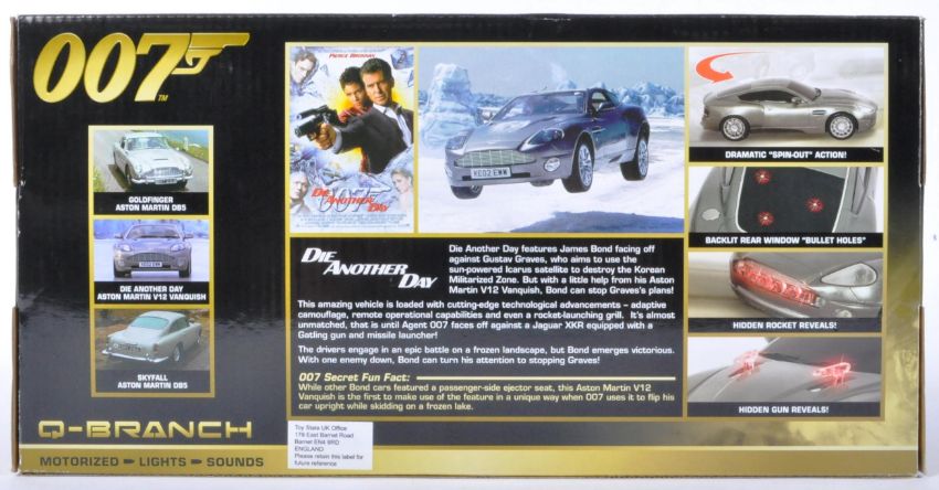 An original boxed Toy State made James Bond 007 Aston Martin V12 Vanquish motorised model car. The car having x4 discreet buttons to the roof that operate working lights and sounds. Housed within original box.