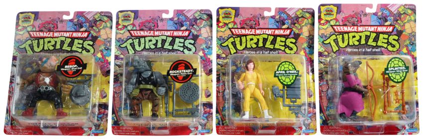 Teenage Mutant Ninja Turtles - a set of x4 Playmates made Teenage Mutant Ninja Turtles ' 25th Anniversary ' 2009 action figures - Bebop, Rocksteady, April O'Neil and Splinter. Contents appear mint and unused (accessories still wired, and on sprues), but bubbles have been resealed - Rocksteady is factory sealed.