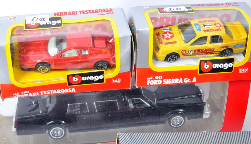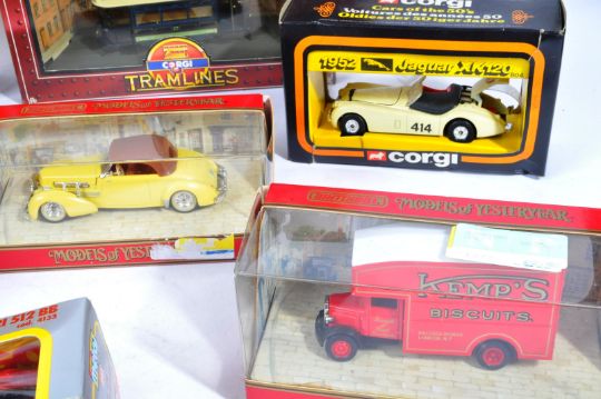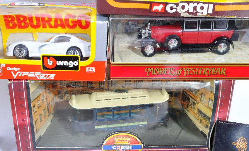 A large collection of approximately x25 assorted diecast model cars and other vehicles of various scales and makers to include Corgi, Matchbox Models of Yesteryear, Bburago, New Ray, Majorette and others. Examples to include Corgi 1953 Jaguar XK120, Majorette Super Movers Limousine, New Ray Jaguar 'E' Cabriolet, Bburago Dodge Viper, Matchbox Y-36 Rolls Royce Phantom and more. All contents generally appearing mint, within original boxes.
