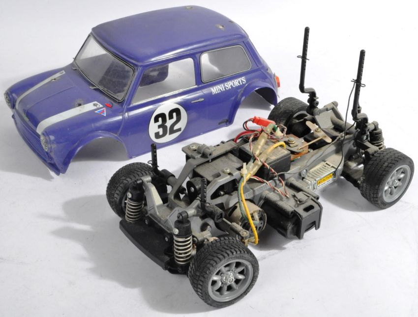 Tamiya - Two original vintage Tamiya made 1/10 scale RC Radio Controlled cars - both Mini Cooper racing cars. The first (purple) appears to be fully made and complete with radio gear, battery etc. The second (green) is just a shell only, with no radio gear fitted. Unboxed. No transmitter.