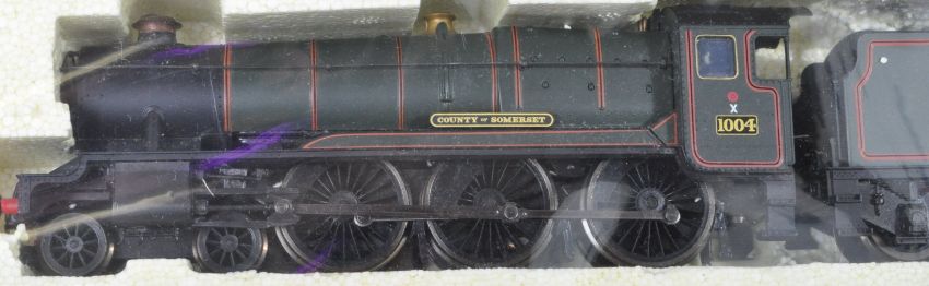An original Hornby 00 gauge model railway trainset locomotive box set No. R2025 ' Great Western Express Passenger Train Set '. The set containing a G.W.R County Class ' County of Somerset ' loco with Three Centenary Coaches. Highly detailed set appearing mint, within original box.