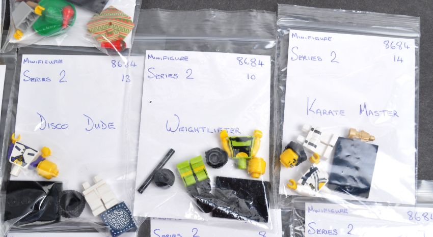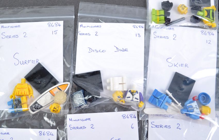 Lego Minifigures - a collection of x20 Lego ' Series 2 ' Minifigures to include; 1. Mexican (x2) 3. Lion Tamer (x2) 4. Wicked Witch (x2) 6. Traffic Cop (x2) 7. Explorer. 8.Lifeguard 9. Mime 10 Weightlifter (x2) 11.Pop Star 12 Skier 13. Disco Dude (x2) 14. Karate Guy 15. Surfer Dude 16. Pharaoh. All minifigures 100% complete with accessory items present. Unbagged.From a large private collection of Lego - the vendor assures us sets are 100% complete (where stated) but contents have not been checked by us. In the majority of cases boxes have been resealed to secure the contents (unless stated as 'factory sealed' in which case the set is unopened). East Bristol Auctions cannot guarantee completeness.
