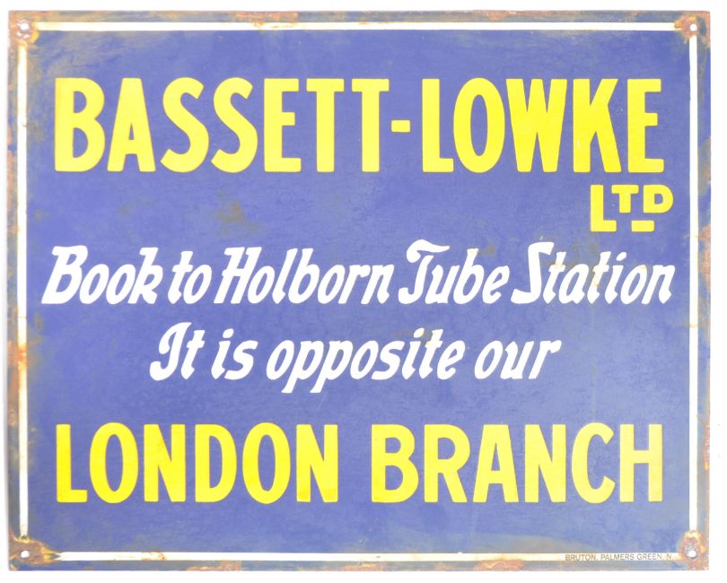 Bassett Lowke - a scarce antique early 20th century Bassett-Lowke advertising enamel sign ' Bassett-Lowke Ltd - Book To Holborne Tube Station - It's Opposite Our London Branch '. Blue ground with yellow and white text. The sign telling customers which tube station gets them to their shop. Rare. Measures approx; 40cm x 50cm.