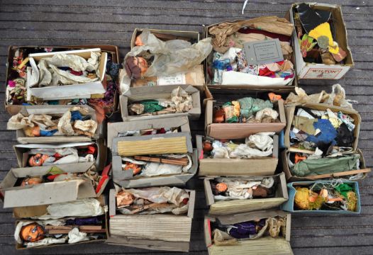 A large and impressive collection of 18x early - mid 20th Century handmade scratchbuilt papier mache painted wooden puppets along with a vast quantity of clothing and accessories. Includes, Pig, Elephant Man, Shakespeare, Chef, Beggar, Medieval, Witch, Fairytale Princesses, Pantomime / theatre related and much more. Some bearing resemblance to Pelham examples. Great collection.