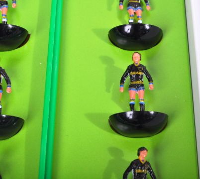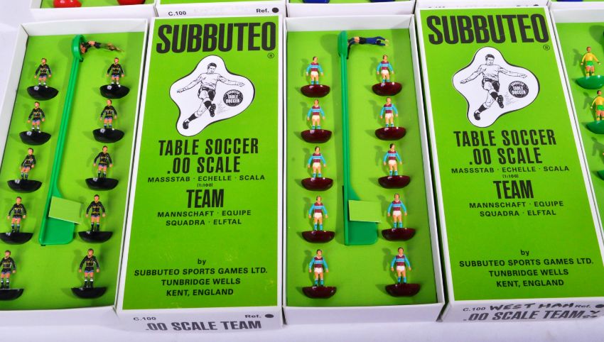 A collection of x10 original vintage Subbuteo table top football / soccer team C100 sets to include; Liverpool, Man United 2nd, Chelsea, West Ham, Norwich City, Exeter City, Arsenal, Nottingham Forest, West Brom and Rotherham. All sets appearing complete in near mint condition within VG+ replica outer boxes.