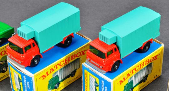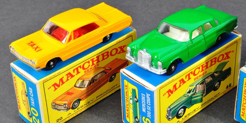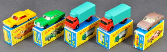 A collection of x5 boxed original vintage Lesney made Matchbox Series diecast model cars and other vehicles comprising; 20 Taxi Cab, 25 Ford Cortina, 44 Refrigerator Truck (x2) and 46 Mercedes 300SE Coupe. Models ranging from VG+ to mint. Within VG boxes.