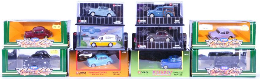 A collection of x10 assorted Corgi Classics made diecast model cars and vans, all of Morris Minor interest. Examples to include x2 TV and Film related models ( Lovejoy and Some Mothers Do 'Ave Em ), 02201 Morris Traveller, 06505 British Caledonian Airways Morris 1000, 01901 Morris Minor and more. All models appearing mint, within original boxes.