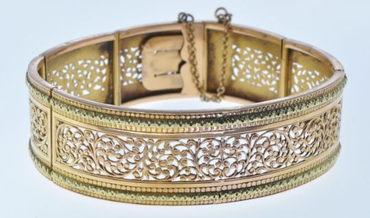 A 20th Century French gold bracelet having six hinged panels with finely pierced foliate panels to each and moulded borders to the edges. The bracelet has a tongue in groove clasp and safety chain. Eagle mark and makers mark to the clasp. Weight 36g. Measures approx 16.5cm interior diameter at widest point.