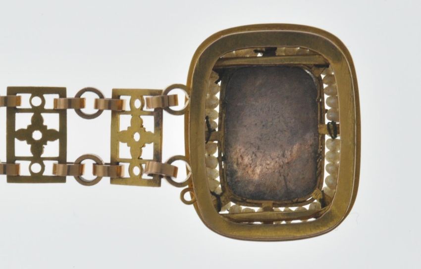 A 19th Century French antique 18ct gold bracelet having rectangular links with pierced foliate details with blue enamelled borders united by round links, the rectangular clasp having a rectangular hand painted miniature panel depicting a seated girl with a border of seed pearls and blue enamel. French eagle mark to the clasp and makers mark present. Measures 7 inches. Weight 21.7g.