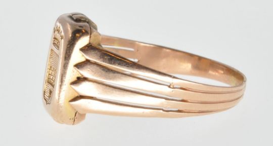 A French antique 18ct gold signet ring having a rectangular head with engraved crest raised on reeded shoulders. French eagle mark to the band. Weight 5.5g. Size V.