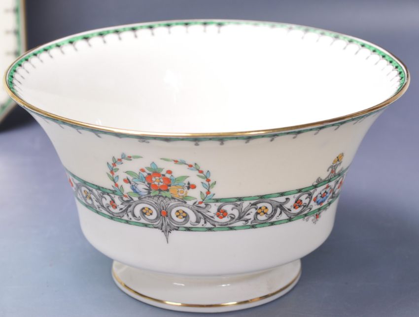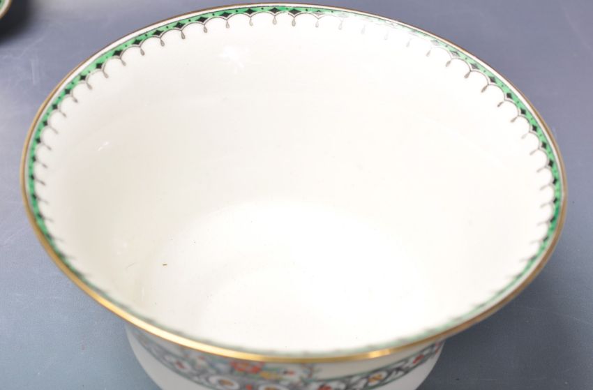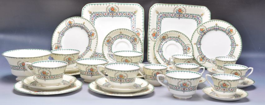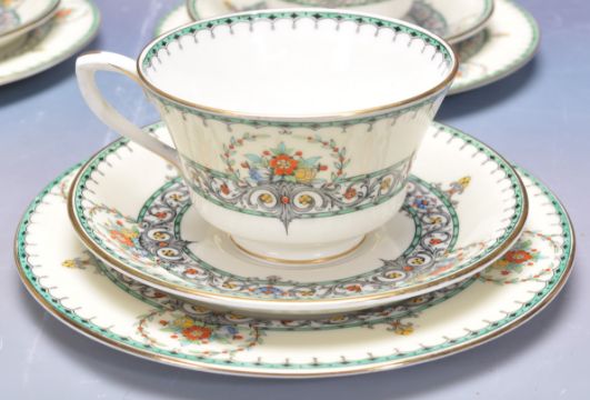 A 20th century vintage Royal Worcester Chalons jewelled tea service comprising of coffee cups and tea cup and saucer trios as well as a large sugar bowl and two square plates.. Marked to the base.