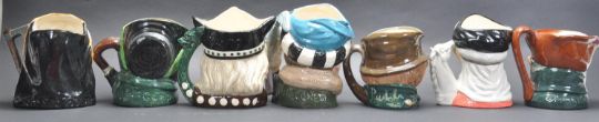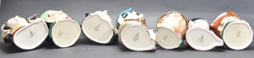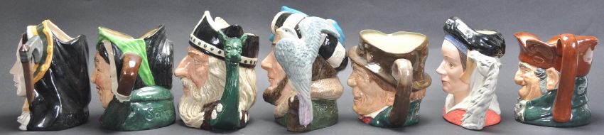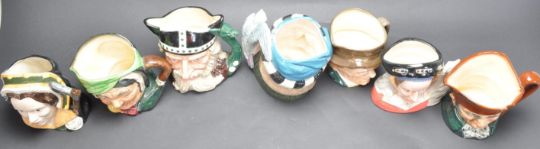 A collection of seven 20th century Royal Doulton toby character jugs to include The Falconer (D 6533), Viking (D 6496), Anne of Cleves (D 6653), Catherine Howard (D6645), Old Charley and Sairey Gamp. Measures 18cm tall.