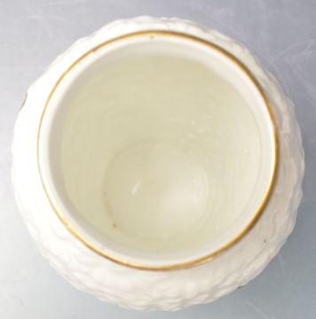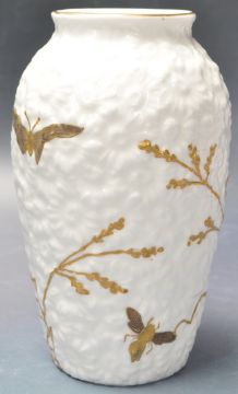 An early 20th century porcelain vase having a textured daisy relief surface with gilt foliate decoration. Possibly Minton. hand painted number to base 5945. Measures 13cm high.
