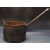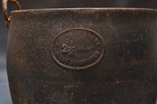 A large vintage 20th century cast metal cooking pot having a tapering angled handle with makers plaque to the side. Plaque reads 2.5 Alls West Bromich. Measures 57cm wide.
