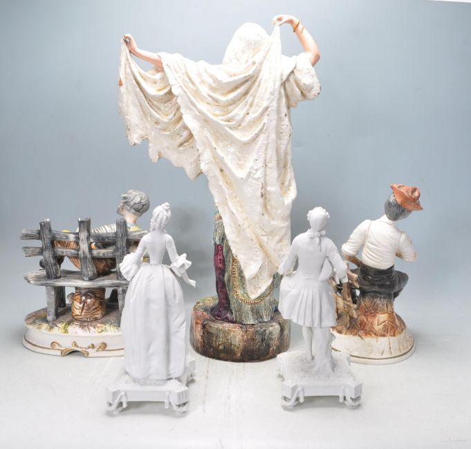 A group of Capo di monte and other figurines to include a large ceramic gypsy figurine (AF repairs to the base), two bisque figurines of Georgian figures, and two capodimonte figurines including a tramp and a man with a rifle.