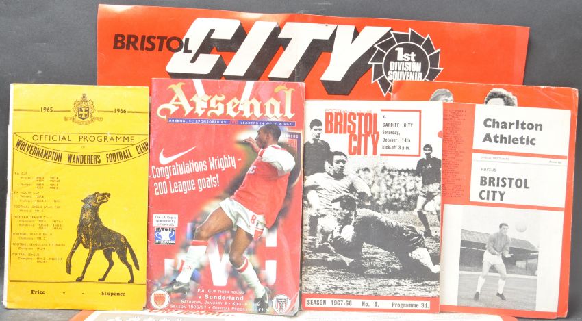 A collection of 1960's Bristol City football programmes to include programmes detailing matches versus teams such as Newport County, Carlisle, Bournemouth Preston and Portsmouth. The majority of matches taking place at Ashton Gate. Together with a group of later football programmes for Arsenal and Wimbledon. Also with a several souvenir items such as a ribbon rosette, badge and banner.