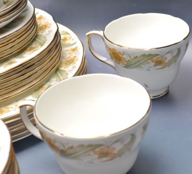 An early 20th century Duchess, Staffordshire, England porcelain tea service in a chintz foliate pattern to include the teapot, cups, saucers, plates etc all being stamped to the underside