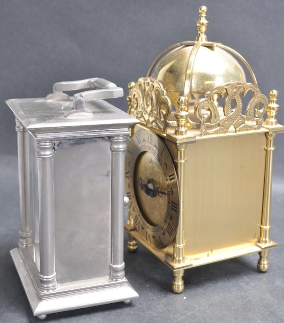 A pair of 21st Century clocks to include a white metal Blandford carriage clock and a brass cased Seiko lantern clock with Indian style decoration such as a domed top and incised patterning. The Seiko clock also having an inscription to the back. Both battery operated.