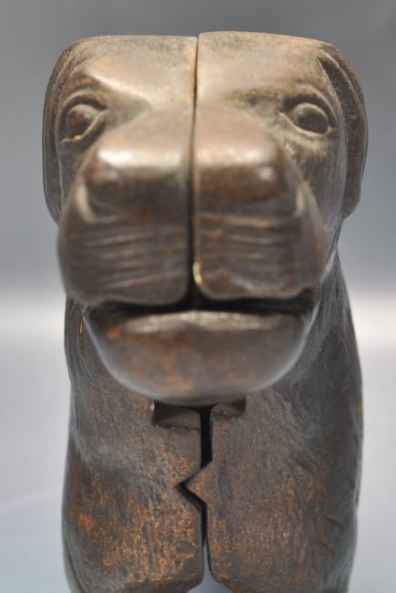 An early 20th century cast metal novelty dog nutcracker, stamped with patent No. 273480 (for Fred Alexander Rimington, 1926), lifting the tail opens the dogs mouth for cracking nuts, Measures 29.2cm long.
