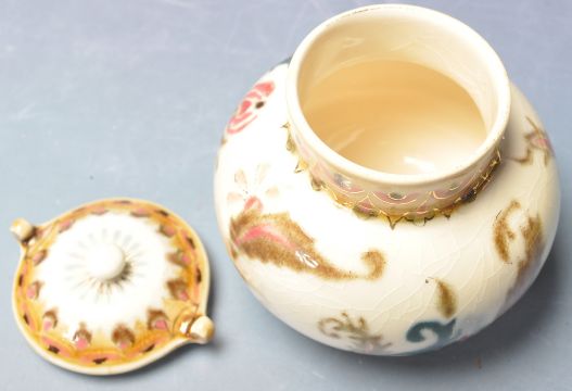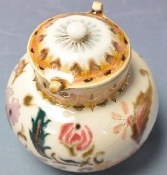 An early 20th century Zsolnay Pecs Hungarian ceramic lidded vase having polychrome foliate decoration. Makers mark to the underside. Measures 10cm high. Signs of wear and tear commensurate with its age. Measures, 10 cm Tall