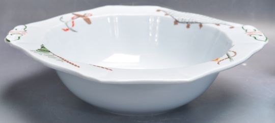 A retro vintage mid 20th century Alfred Meakin china fruit set in the Harmony Venetian Blue pattern. The set is  decorated in a stylised fisherman / harbour scenes. Seven scenes in total. Largest measures 22cm.