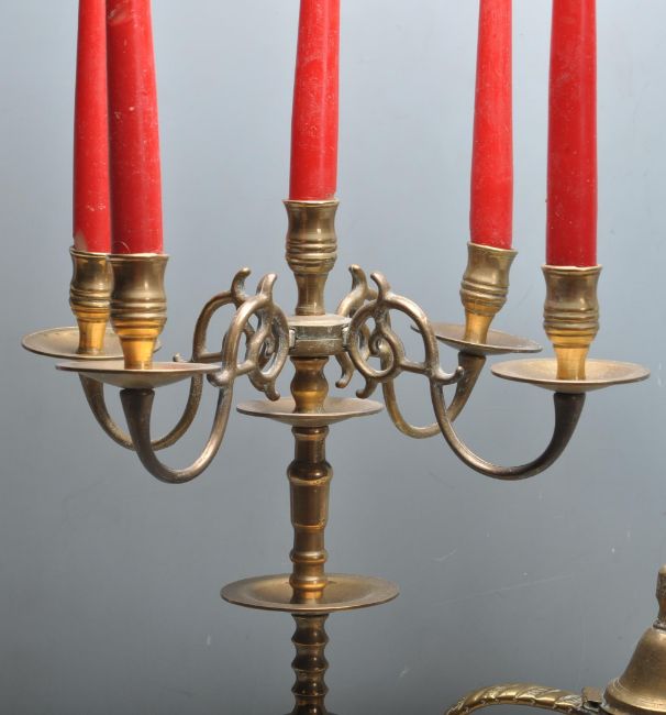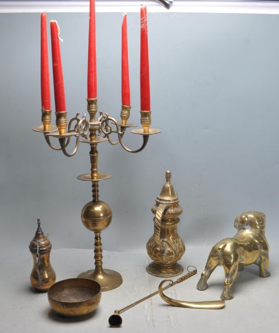 A collection of vintage 20th century brass wares to include a large brass bulldog, brass candelabra, Moroccan brass dallahs, brass cat etc.
