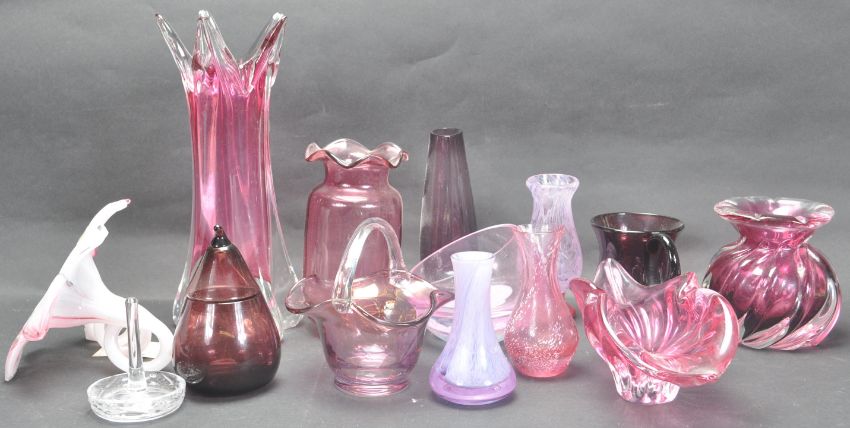 A large collection of 20th century glass to include Murano style vases, Caithness stem vase, a studio art glass flower ornament and more. Measures 30cm tall.
