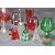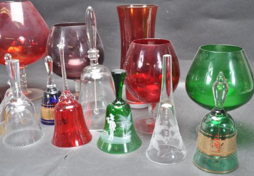 A collection of 20th century glass hand held bells to include cut glass and coloured glass examples, alongside a group of 1960s / 1970s brandy shaped goblet vases in a variety of colours. Measures 28cm tall.