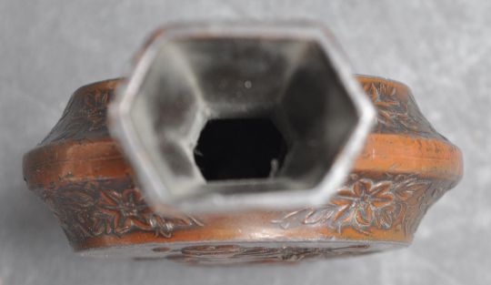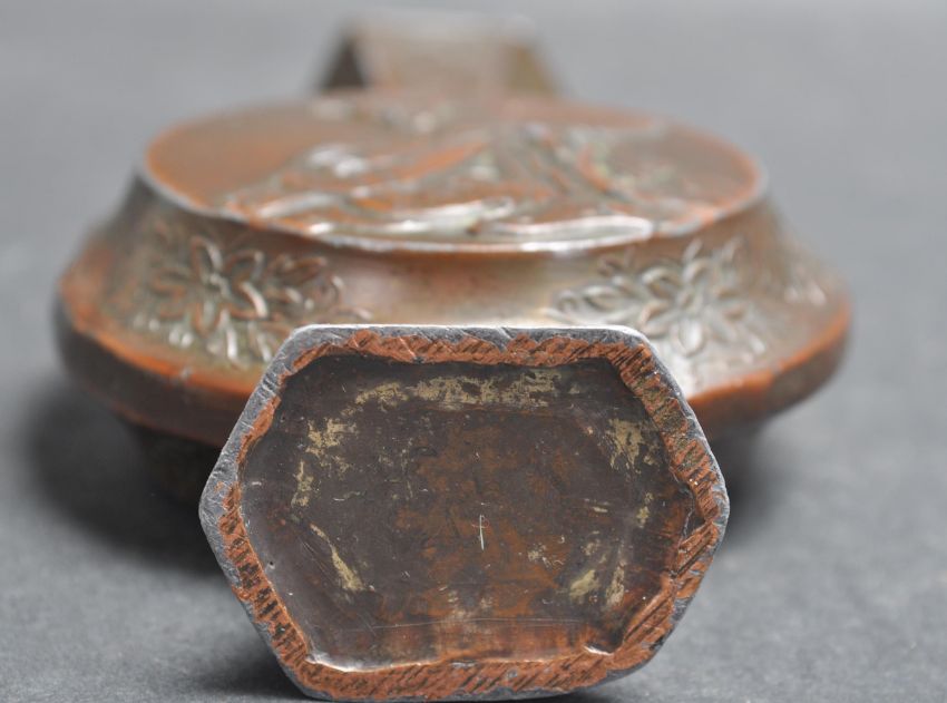 An early 20th century 1920s Japanese brass moon vase having raised decoration of a Geisha girls, birds and foliage. Measures 13cm high. Signs of wear and tear commensurate with its age.
