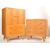 A vintage retro 20th century circa 1950’s light oak bedroom suite. The suite comprising of a tallboy having twin doors cupboard atop with inner shelf above two long drawers with pull handles raised on angular legs along with a three drawers matching chest of drawers. Measures 116cm high x 76cm wide x 46cm depth.