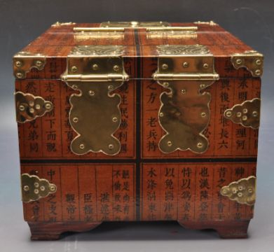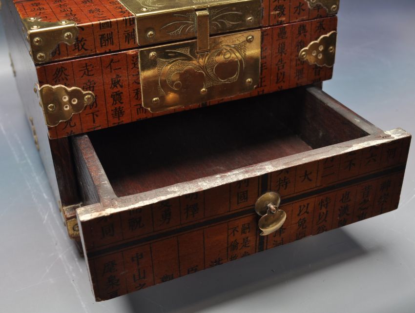 A 20th century unusual Chinese lacquer and brass bound casket. The casket of rectangular form with lacquer finished character mark detailed panels set with brass exterior bracket work and hinges to the multiple compartments. Measures 17cm x 20cm x 29cm.