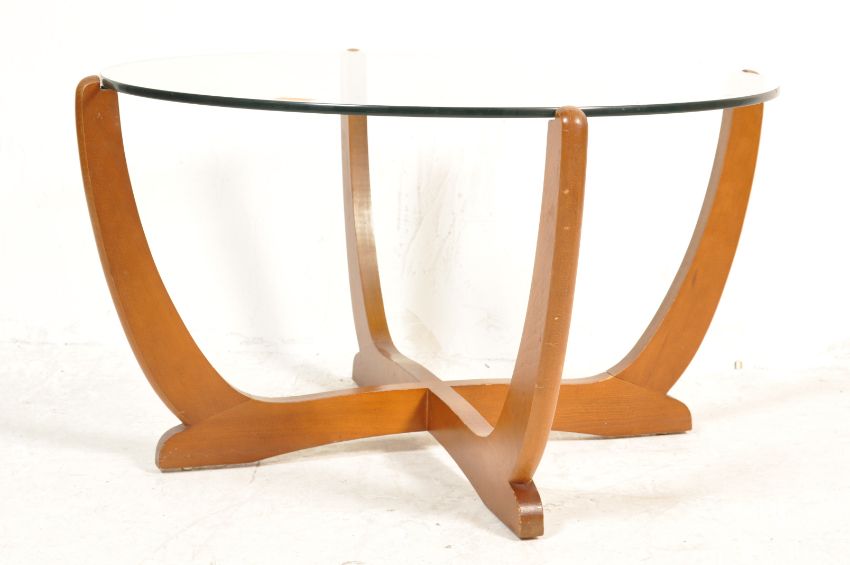 A vintage retro mid 20th century teak wood and glass coffee table. The coffee table with round glass top over angled teak cross show wood frame in the manner of G Plan. Measures 45cm x 77cm.
