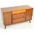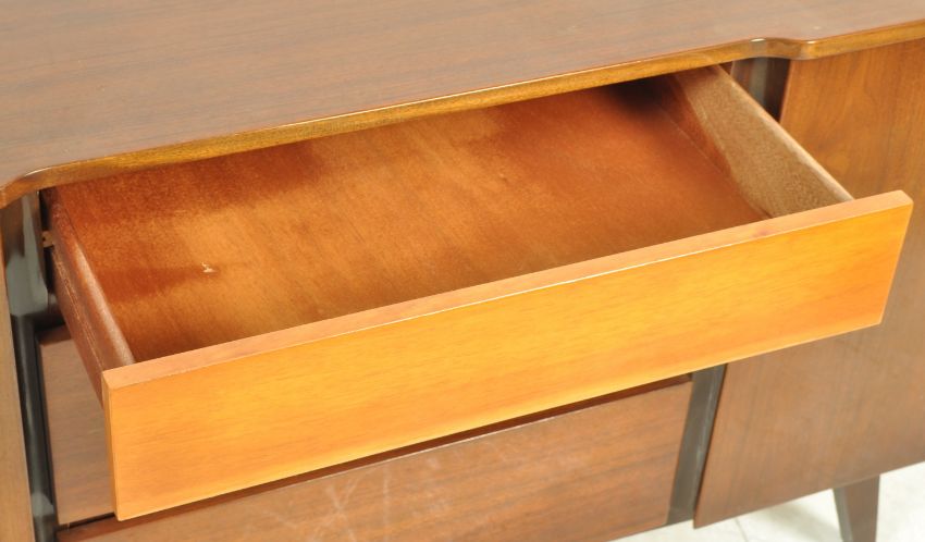 A vintage retro mid 20th century teak wood veneer sideboard credenza of small proportion having a bank of three graduated drawers to the centre flanked by single door cupboards raised on angular legs. Measures 68cm x 115cm x 46cm.