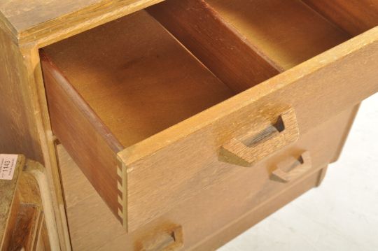 A retro 1970's Ernest Gomme for G-Plan ' Brandon ' oak bedroom suite. To include a dressing table chest raised on shaped legs with a series of drawers. The top with recessed drop centre beneath mirror atop together with a G plan chest of drawers having a bank of four drawers with wooden pulls raised on an upright base. E Gomme gilt stamp to the drawer. Measures 83cm high x 76cm wide x 45cm depth.