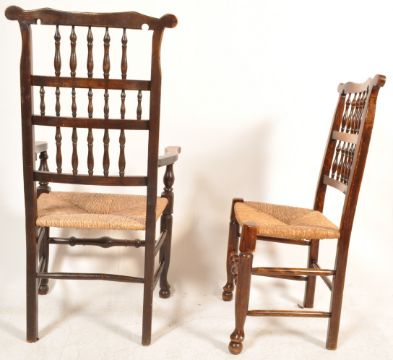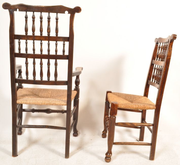 A set of five 19th century Victorian oak Lancashire / North Country farmhouse rush seat dining chairs. The chairs having spindle backrest with shaped top rails, rush slip seats and spindle stretchers raised on shaped supports.