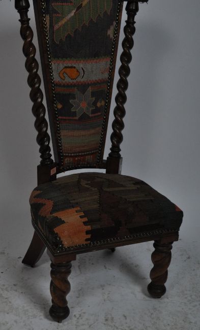 A 19th century Victorian Prie Dieu / prayer chair. The chair thawing a T- shaped backrest with twin barely twisted column to each side, embroidery upholstery raised on twisted legs. Measures approx. 106cm x 48cm x 43cm.