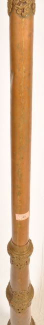 A large circa 1900 Tibetan kangling horn / hunting horn. The copper horn of a large size having topical Tibetan brass decoration with red, blue stones. measures: 200cm long