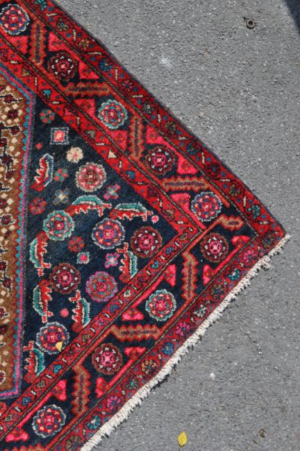 A 20th century Persian Islamic Koljai hand woven wool on cotton carpet rug being decorated with brown diamond motifs with red flower head motifs, dark blue corners with foliage motifs, blue main border decorated with red serpentine and floral motifs flanked by two red borders having blue pile directions and white fringe to rack end. Measures 247cm x 127cm.