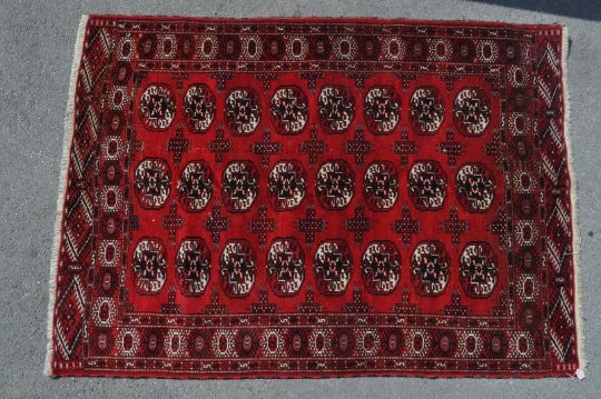 A 20th century Persian Islamic Afghan hand woven / knotted carpet rug having black and white hexagonal medallions separated by cross band motifs on a red field, black and white floral heads decoration to the main border linked by two small border decorated with “ S “ marks. Black and red pile direction to rack side and white fringes to each end. Measures 200cm x 145cm.