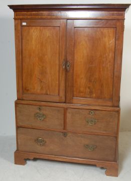 An 18th century George III mahogany linen press. Raised on ogee bracket feet with short and deep drawer configuration having linen cupboard atop being converted to hanging. Flared cornice above.