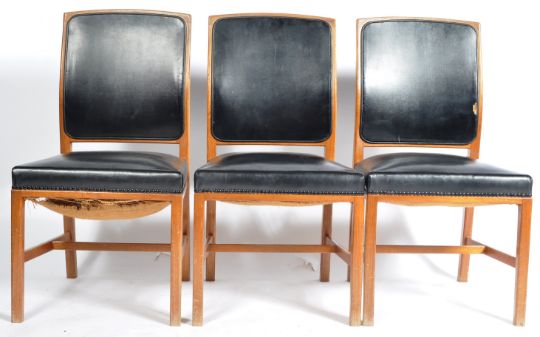 Tom Lupton & John Morton - LM Furniture Ltd of Wallingford - A set of six retro vintage mid 20th Century teak framed and leather dining chairs. The chairs consisting of four dining and two carver armchairs each with teak frames and padded black leather back and seat rests. Each raised on tapering supports united by H-stretchers. Condition; age related ware throughout, all structurally sound. Carvers measures approx;  88cm x 53cm x 49cm.