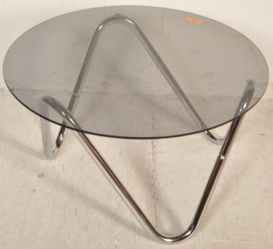 A vintage retro 20th century circa 1970s Danish inspired glass coffee table. The table of a circular form with smoked glass raised on chrome tubular frame. Measures 34 cm H x 61 cm W x 61 cm D