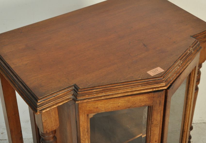 A 19th century Victorian mahogany glazed cabinet / display cabinet of an unusual form with twin glazed doors to the front, inner shelf flanked by four turned columns raised on turned legs. Measures, 78 cm H x 68 cm W x 42 cm D