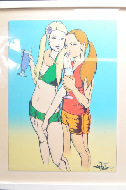 A group of four contemporary urban graffiti art prints by Bristol street artist Tame, entitled Ice Cream Girl (2000), Cocktail Girls (2000). Framed and glazed. Together with two unframed prints on silk paper board Gangster Pimp (2000) and Hip Hop Style (2000). Measures 53cm x 43cm.