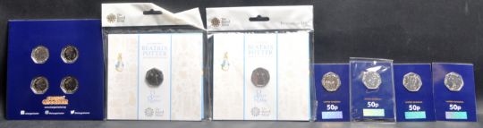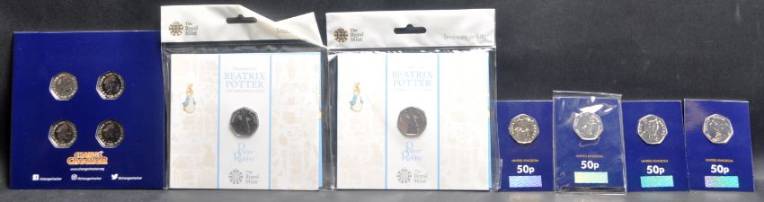 Royal Mint - a collection of x10 Beatrix Potter / Peter Rabbit uncirculated 50p commemorative coins. Includes; x2 Royal Mint ' Celebrating Beatrix Potter And Her Little Tales ' 50ps, a 2018 Beatrix Potter 50p Coin Collecting Pack, and x4 Change Checker uncirculated 50ps.