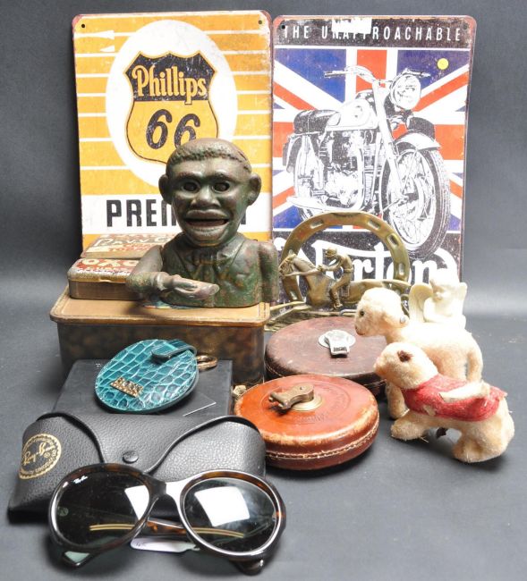 A large collection of vintage retro mid 20th century items / collectors items. The collection include a vast variety of ladies powder compacts, Ray-Ban glasses, cast iron money box, Stiff lam, two tape measures, and many more items