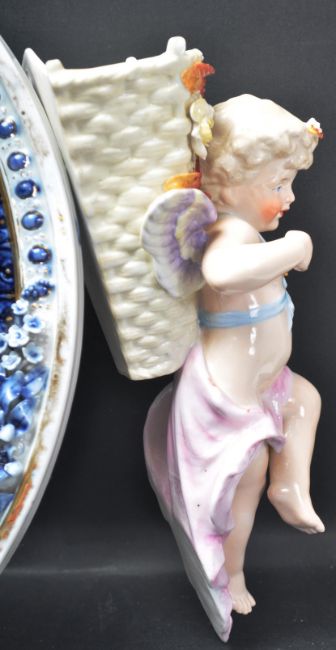 A group of early 20th Century cherub ceramics to include a ceramic oval wall mirror with encrusted florals and cherubs to the top together with another similar small freestanding mirror with crossed sword marks to the base, together with two cherub wall pockets.